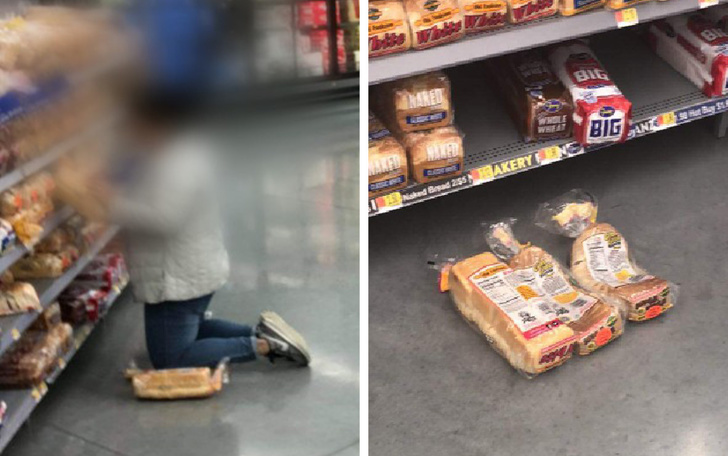 Bu kadın diğer ekmeğe bakarken ekmek üzerine diz çökmüş.