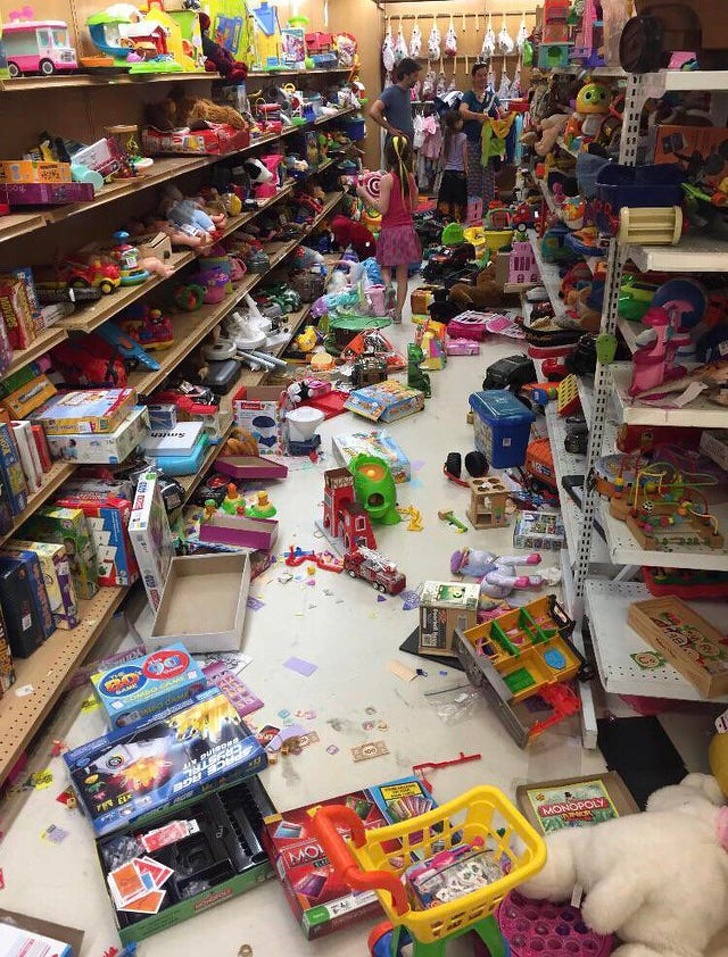 Ebeveynler çocuklarıyla birlikte bir mağazada oyuncak koridorunu bu hale getirdi.