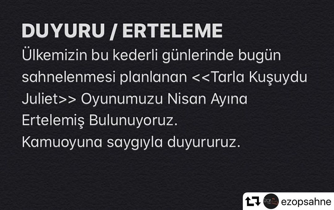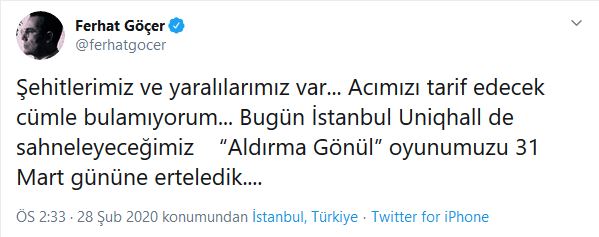 “şehitlerimiz ve yaralılarımız var... acımızı tarif edecek cümle bulamıyorum... bugün istanbul uniqhall de sahneleyeceğimiz “aldırma gönül” oyunumuzu 31 mart gününe erteledik...”