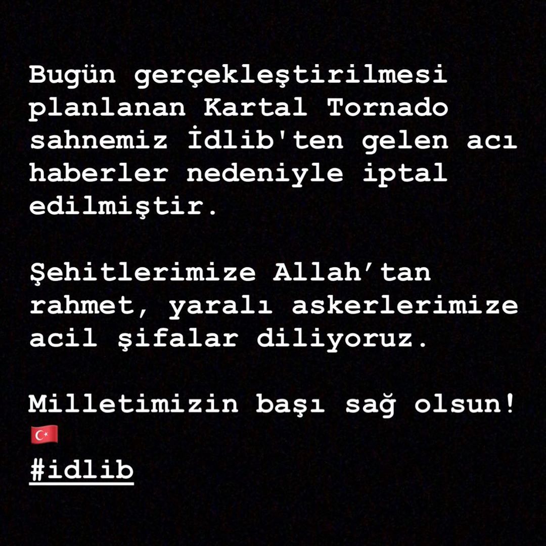 “bugün gerçekleştirilmesi planlanan kartal tornado sahnemiz idlib'ten gelen acı haberler nedeniyle iptal edilmiştir. şehitlerimize allah’tan rahmet, yaralı askerlerimize acil şifalar diliyoruz. milletimizin başı sağ olsun!”