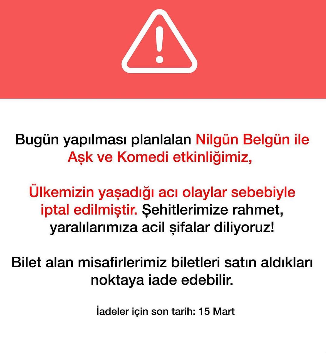 Sanatçı nilgün bergün, ınstagram üzerinden yaptığı paylaşımla ‘nilgün belgün ile aşk ve komedi’ etkinliğinin ertelendiğini belirtti.