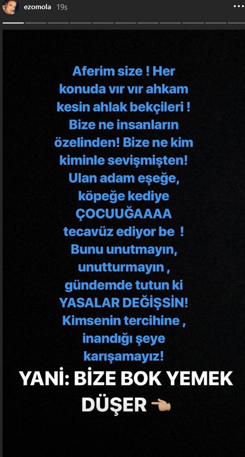 “çocuklara, kadınlara, hayvanlara, her türlü savunmasız canlıya her türlü taciz, şiddet ve sapkınlığın yapıldığı, her gün bu türde yeni haberlerin okunduğu bir dönemde artık yetişkinlerin hür iradeleriyle yaşadıkları özel hayat hayatları üzerinden “ahlak” devşirmeyi bıraksak mı? çok sahte oluyor zira.”