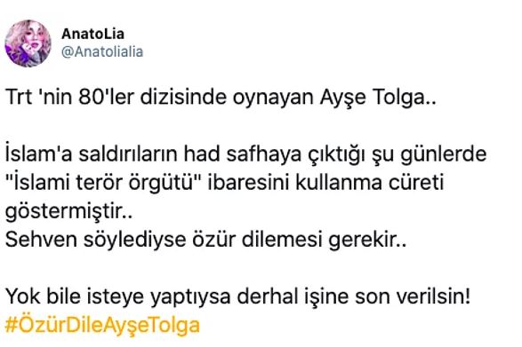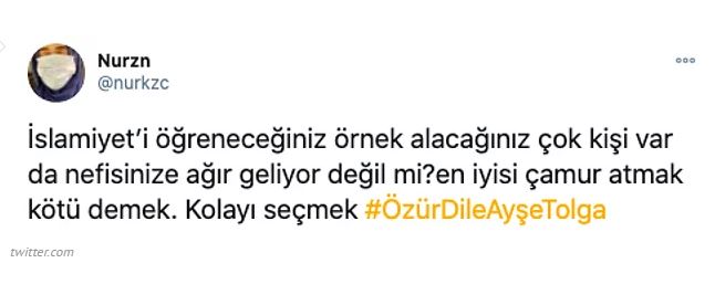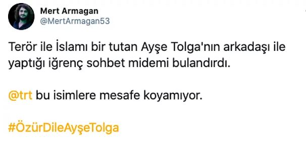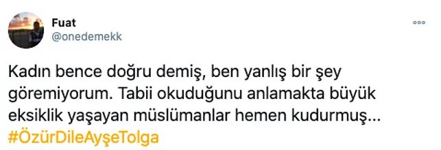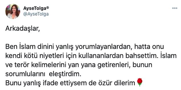 Açıklamala şu şekildeydi. islam dininin terörle bağdaştırılmasına tepki gösteren twitter kullanıcıları tarafından ise #özürdileayşetolga hashtagı kısa süre içerisinde tt oldu