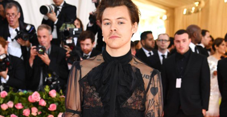 25 yaşındaki ingiliz şarkıcı harry edward styles, met gala gecesinde bir kadın gibi giyinerek hayranlarını şaşırttı.