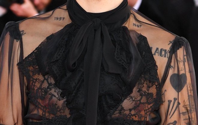 Harry styles, tülden bir tulum giydi.