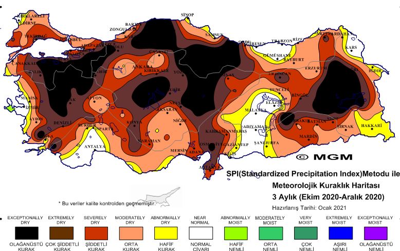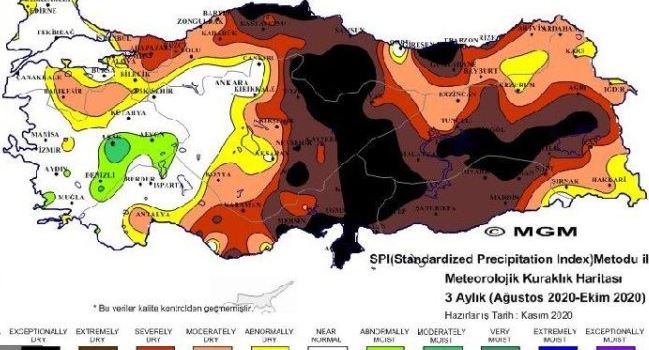 Kamuyu ile paylaşılan spı metoduna bakıldığında son 3 aylık haritada güney marmara, iç ege, batı karadeniz, doğu anadolu bölgelerinde önemli bir ‘’olağanüstü kuraklık, çok şiddetli kuraklık ve şiddetli kuraklık’’ notları bulunuyor.