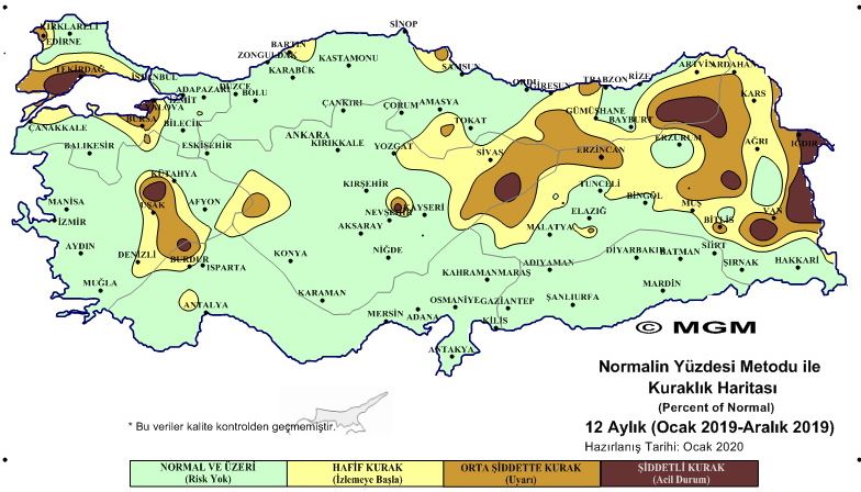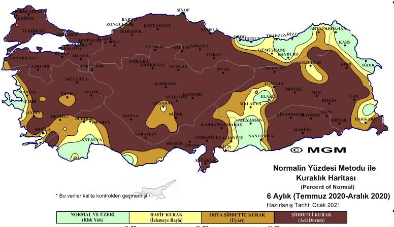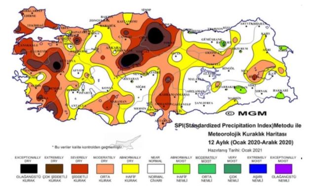 Türkiye’nin önemli bir bölümünün yağış almadığı aralık ay ve son 3 – 6 aylık dönemde ‘’olağanüstü ve şiddetli kuraklık’’ görüldüğü belirtildi. meteoroloji genel müdürlüğü, standart yağış indeksi ve normalin yüzdesi metotlarına bakıldığında elde edilen veriler oldukça korkutucu. türkiye’nin özellikle ikinci yarasında hiçbir şekilde beklenen yağışı alamadığı belirtiliyor. bundan kaynaklı olarak olağanüstü kuraklık hali ilan edilebilir.