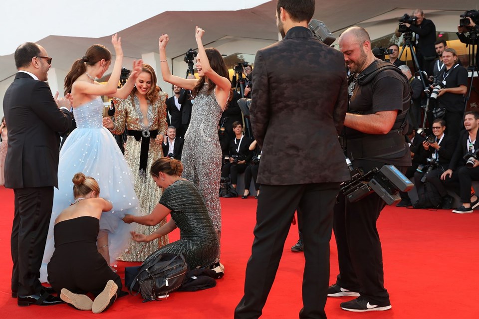 Başrol oyuncuları natalie portman, stacy martin ve raffey cassidy elbise kazasını eğlenceli anlara dönüştürdü.