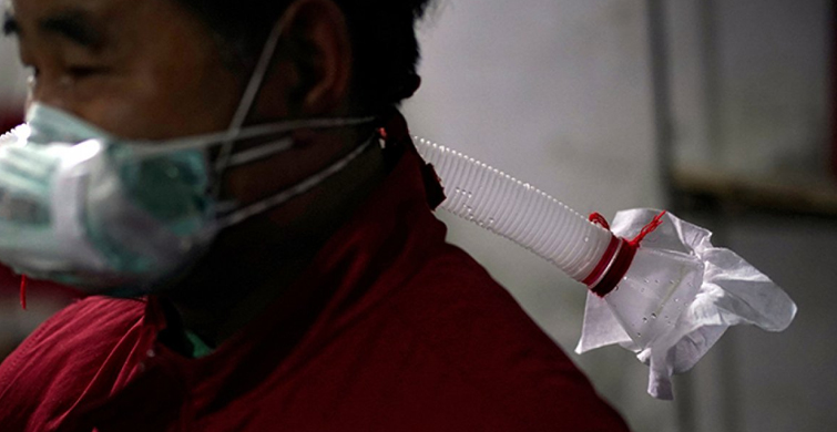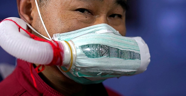 Guangyu, virüse karşı önlem amaçlı su şişesinden yaptığı maskeye bir de hortum bağlamıştı.