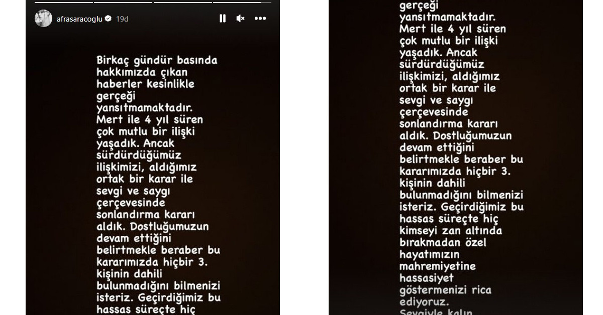 4 yıldır Mert Yazıcıoğlu ile birlikte olan Afra Saraçoğlu, haklarında çıkan ayrılık haberlerini doğruladı.