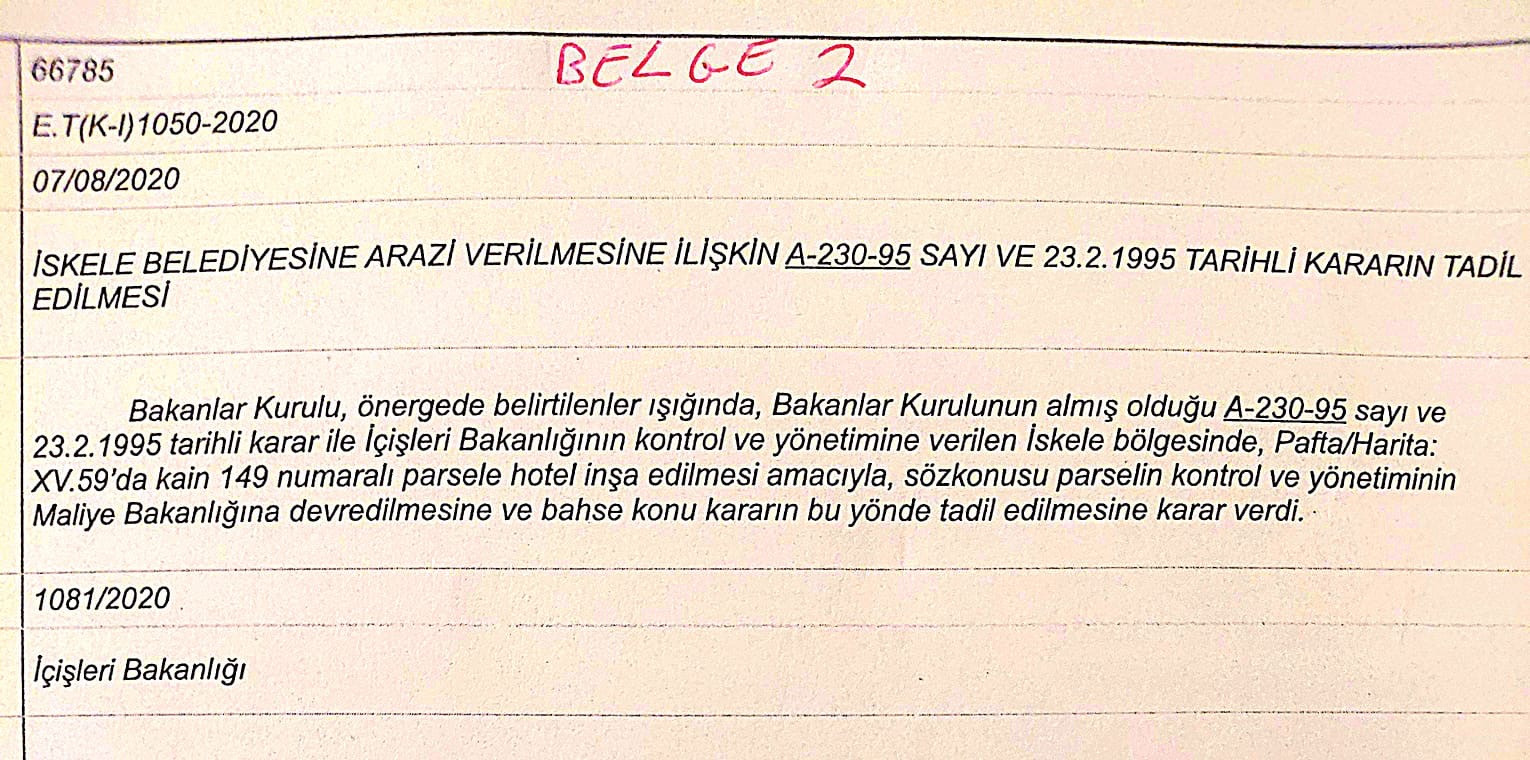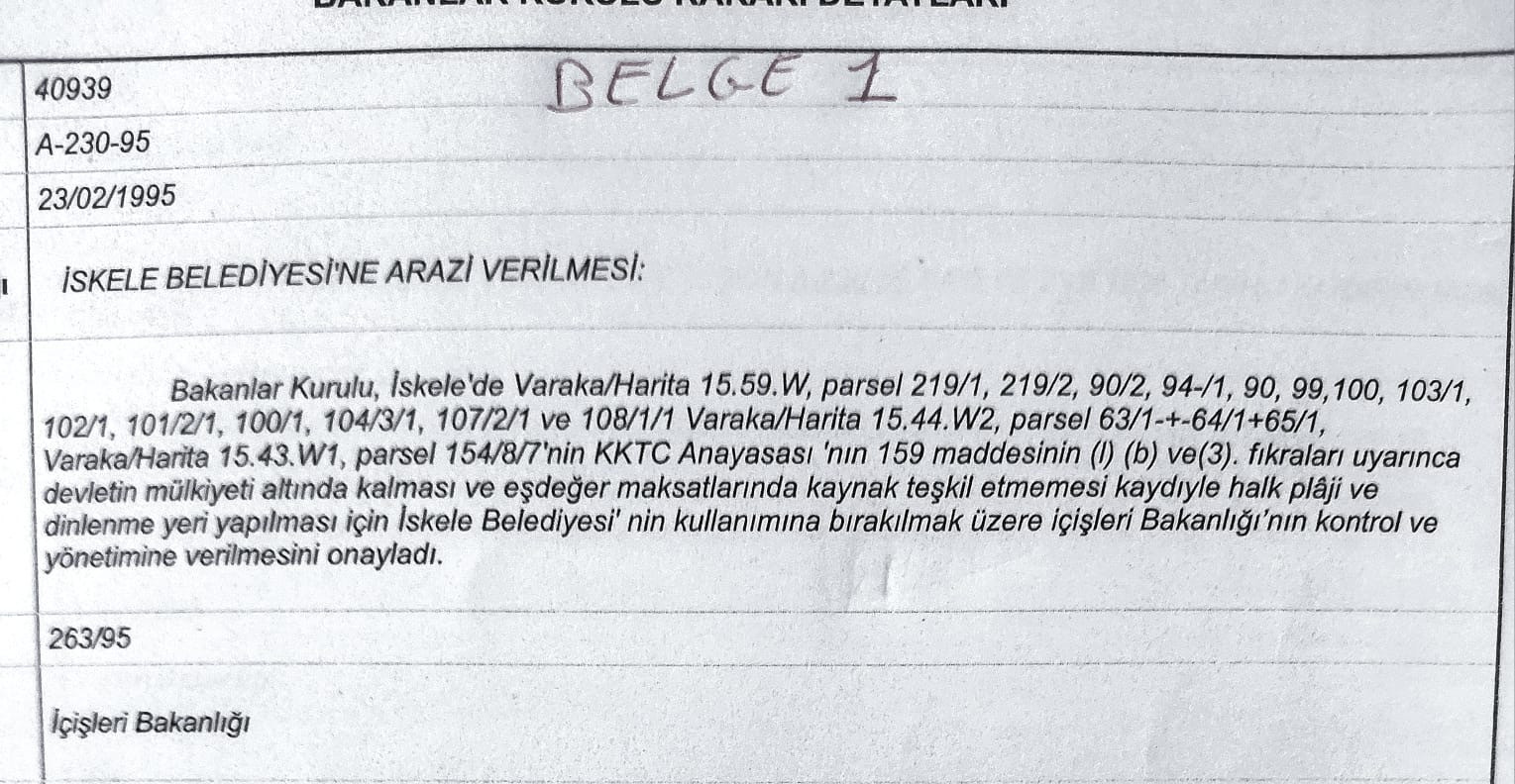 Arazi ilk kez Başbakan Hakkı Atun döneminde alınan, 23 Şubat 1995 tarihli ve " A-230-95" sayılı Bakanlar Kurulu kararı ile, " mülkiyeti devlette kalması kaydıyla, halk plajı ve dinlenme yeri yapılması için" İskele Belediyesi'ne verildi. (BELGE 1: ilgili karar)