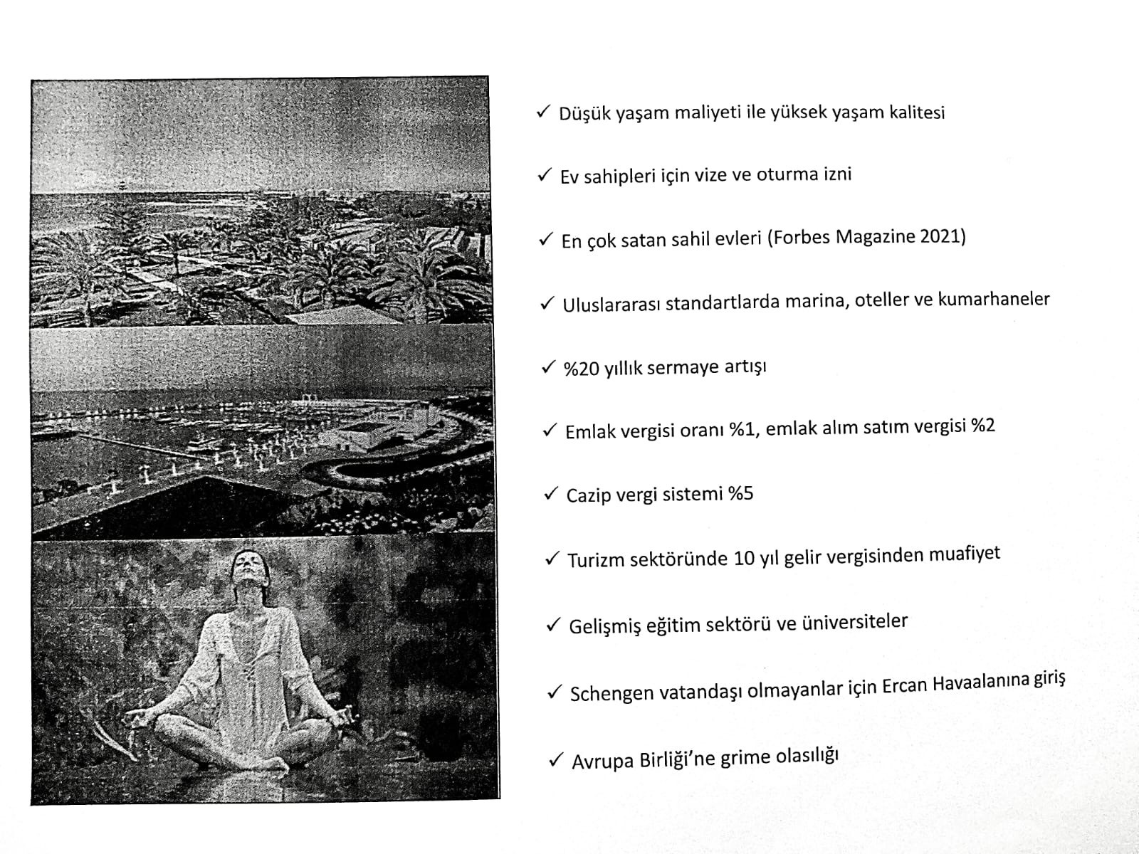 Yine aynı amaçla reklamlarda, "TURİZM YATIRIMLARINA 10 YILLIK VERGİ MUAFİYETİ OLDUĞU, KKTC’NİN AB'A GİRME İHTİMALİ OLDUĞU (yalana bakın!) VE 10 YILLIK SÖZLEŞME SÜRESİNİN 99 YILA KADAR ÇIKARILABİLECEĞİ" de reklamlarda belirtiliyor.