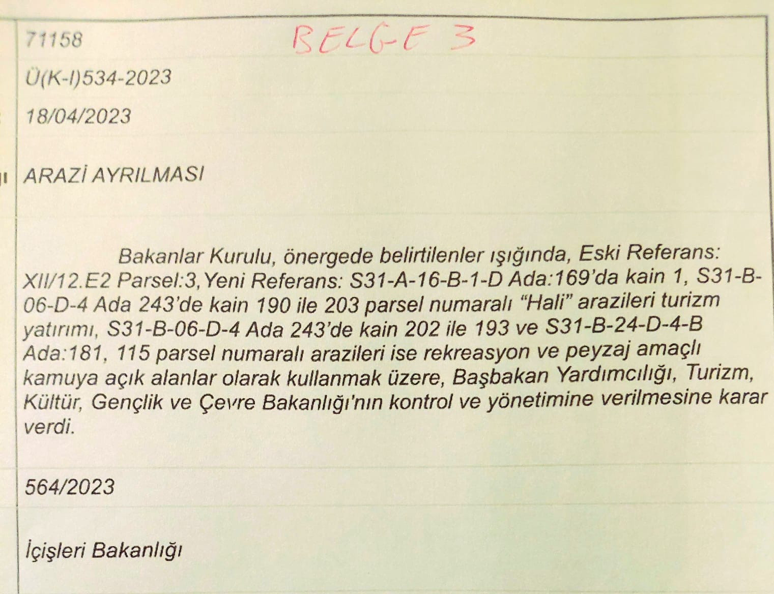 ÜNAL ÜSTEL'İN BAŞBAKAN OLDUĞU NİSAN 2023'TE İSE, ÇIKARILAN BAKANLAR KURULU KARARI İLE ARAZİ, "TURİZM YATIRIMI İÇİN" TURİZM BAKANLIĞI'NA AKTARILDI