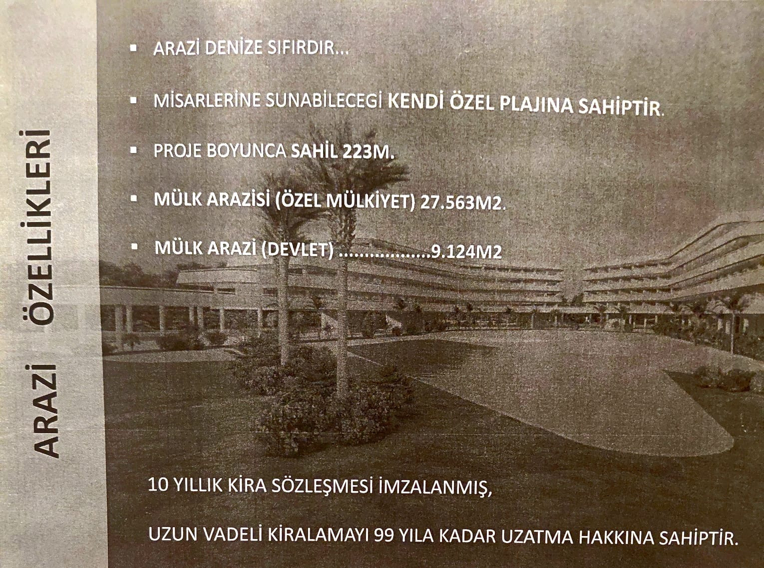 SATIŞ REKLAMINDA, ARAZİNİN DENİZE SIFIR, ÖZEL PLAJLI VE SAHİL BOYUNUN 223 METRE OLDUĞU BELİRTİLİRKEN, 27563 METREKARENİN ÖZEL MÜLKİYET, 9142 METREKARENİN İSE DEVLET ARAZİSİ OLDUĞU VURGULANDI.