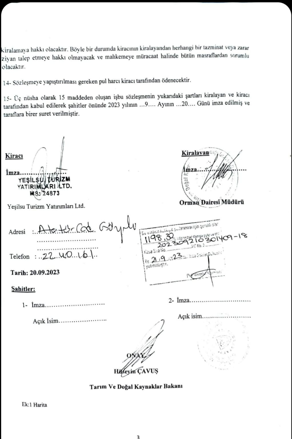 Nitekim, Ünal Üstel'in, Arabacıoğlu'nun bu kaybına karşılık ona, "Ötüken/İskele'de 1918'den beri orman olarak kaydı bulunan Ambelia Ormanlarından, denize sıfır, 21 dönüm orman arazisi verdiği kesinleşmiş bir bilgi. İmzalanan kira sözleşmesi elimde var. (BELGE 5: Arabacıoğlu ile imzalanan kira sözleşmesi)