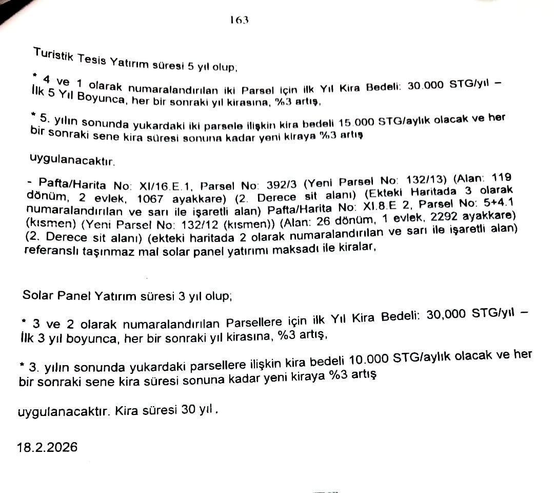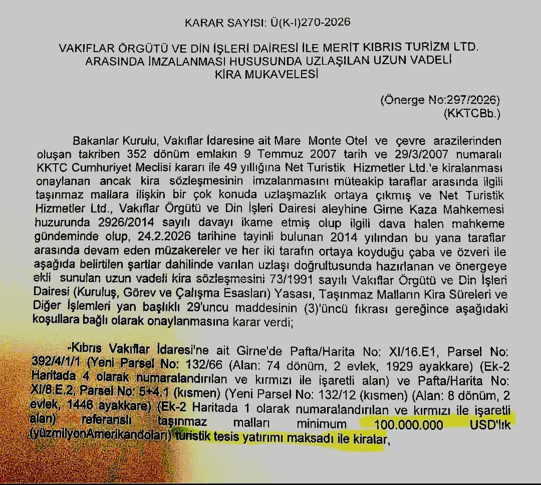 BAŞBAKAN ÜNAL ÜSTEL TARAFINDAN BAKANLAR KURULU'NA SUNULAN "297/2026" SAYILI ÖNERGE ÇERÇEVESİNDE 18 ŞUBAT 2026'DA ALINAN " Ü (K-I) 270-2026" SAYILI KARARA GÖRE, MERİT DİAMOND HOTELİ İLE MARE MONTE YOLU ARASINDAKİ 82 DÖNÜM 5 EVLEK VAKIF ARAZİSİ, AYDA 2500 STERLİN KİRA İLE MERİT GURUBU'NA KİRALANDI.