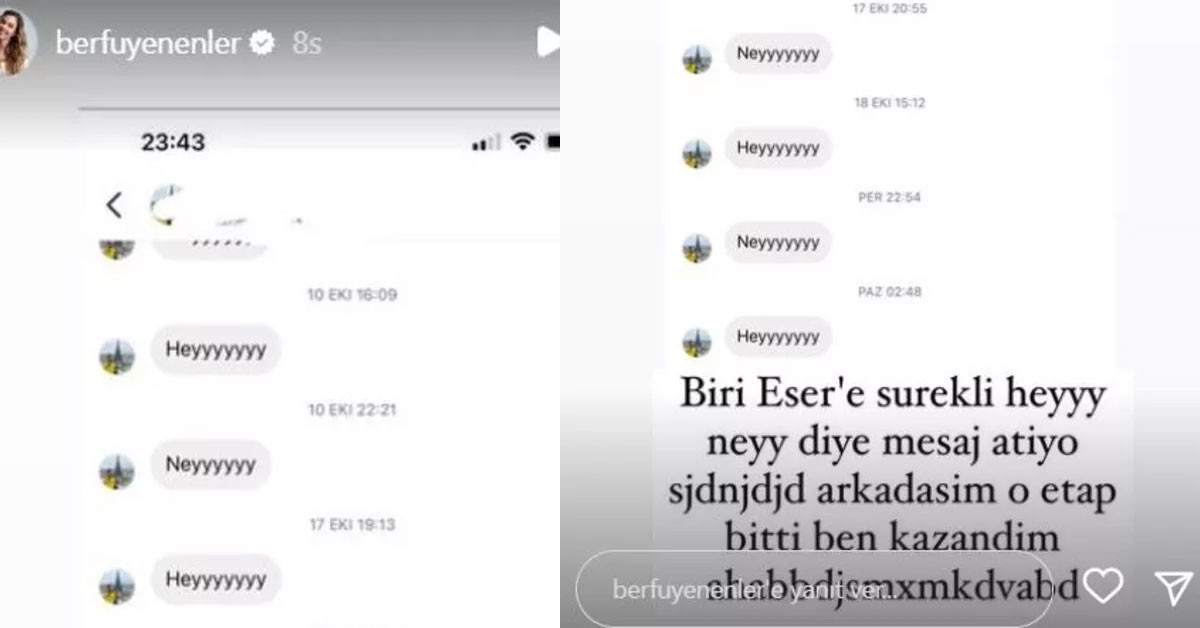 Berfu Yenenler kocasında sürekli "Hey" diye mesaj atan kişiyi ifşa ederek "Biri Eser'e sürekli hey ney diye mesaj atıyor, arkadaşım o etap bitti ben kazandım" dedi.