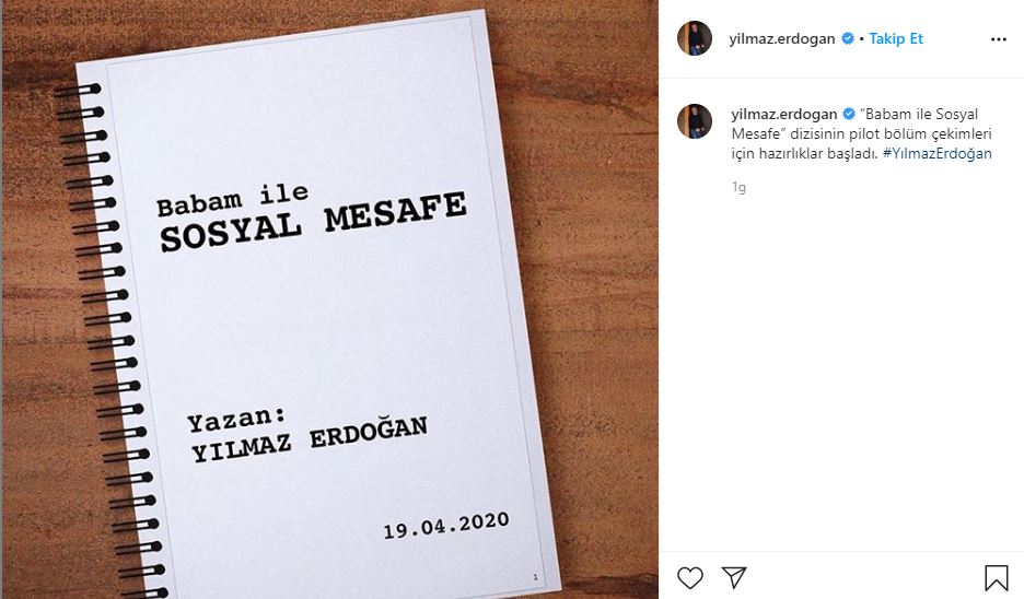 'babam ile sosyal mesafe' projesinin senaryosunu sosyal medya hesabından paylaşan erdoğan, '“babam ile sosyal mesafe” dizisinin pilot bölüm çekimleri için hazırlıklar başladı.' notunu ekledi.