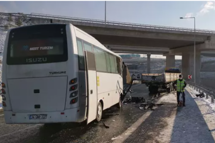 Edinilen bilgiye göre, içerisinde turist kafilesinin olduğu öğrenilen m.ş. idaresindeki midibüs, kar yağışı sonrasında yolda oluşan buzlanma nedeniyle sürücüsünün direksiyon hakimiyetini kaybetmesi sonucu hemen önünde seyreden m.b. yönetimindeki tır’a çarptı.