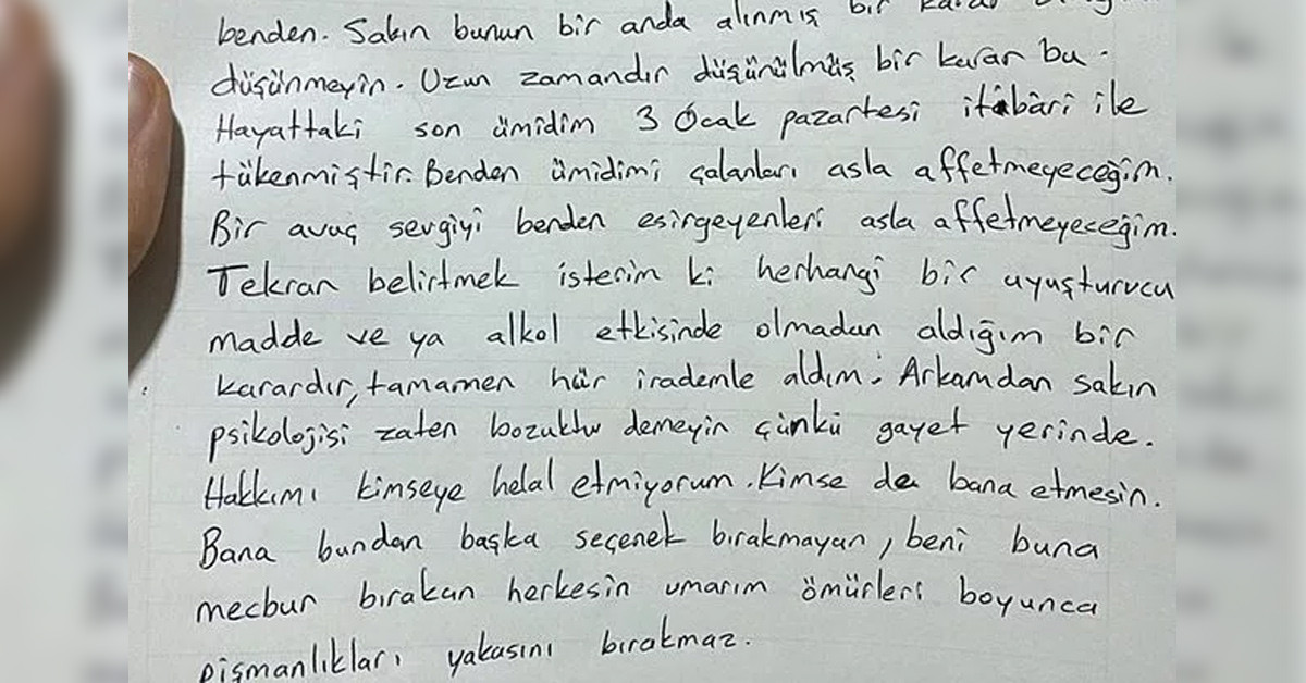 "Sakın bunun bir anda alınmış bir karar olduğunu düşünmeyin. Hayattaki son ümidim 3 Ocak Pazartesi tükendi. Ümidimi çalanları bir avuç sevgiyi benden esirgeyenleri asla affetmeyeceğim. Tekrar belirtmek istiyorum. Herhangi bir uyuşturucu veya alkol etkisinde değilim. Tamamen hür irademle aldım bu kararı. Arkamdan sakın zaten psikolojisi bozuktu demeyin, gayet yerinde. Hakkımı kimseye helal etmiyorum. Kimse de bana etmesin. Umarım ölümüm hayatımdan daha değerli olur.”