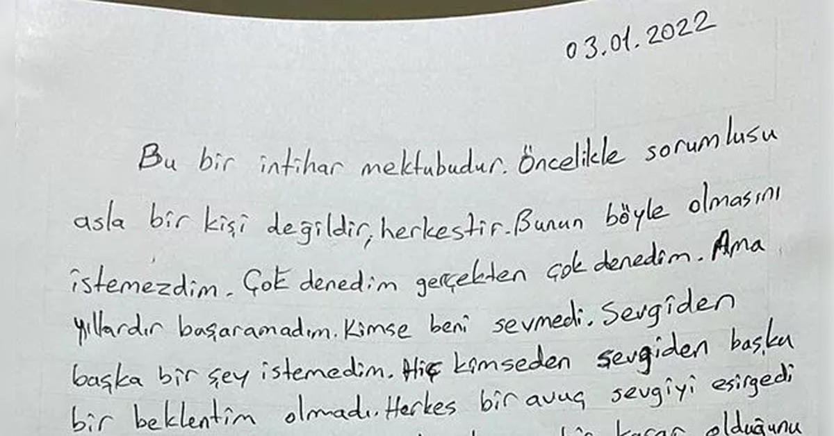 "Bu bir intihar mektubudur. Öncellikle sorumlusu asla bir kişi değildir. Herkestir. Bunun böyle olmasını istemezdim. Çok denedim gerçekten çok denedim ama yıllardır başaramadım Kimse beni sevmedi. Sevgiden başka bir şey istemedim. Herkes bir avuç sevgiyi esirgedi benden."