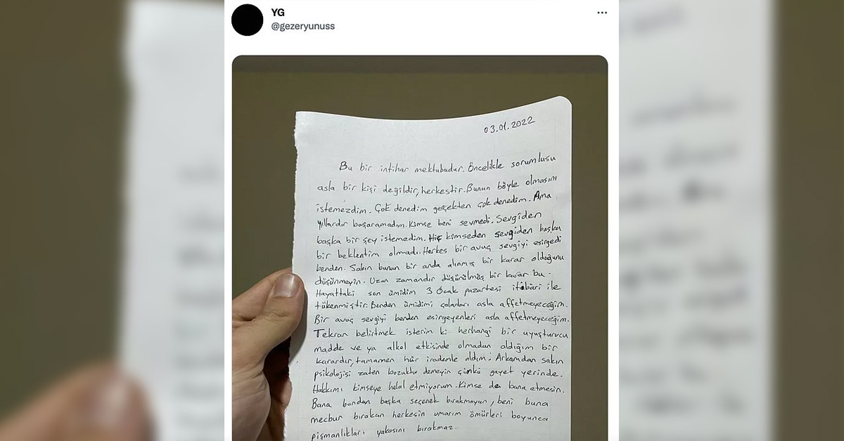 İzmir’de yaşayan Yunus Gezer üniversite öğrencisiydi. 25 yaşındaki Gezer, aslen Aydınlıydı. Yunus Gezer, sosyal medya hesabından paylaştığı veda mektubu ardından kendini asarak hayatına son verdi. Mektubu sosyal medyada gören Gezer’in yakınları bu durumu polise bildirdi. Daha sonrasında 25 yaşındaki gencin evine giden polis ve sağlık ekipleri, Yunus Gezer’in cansız bedeni ile karşılaştı.