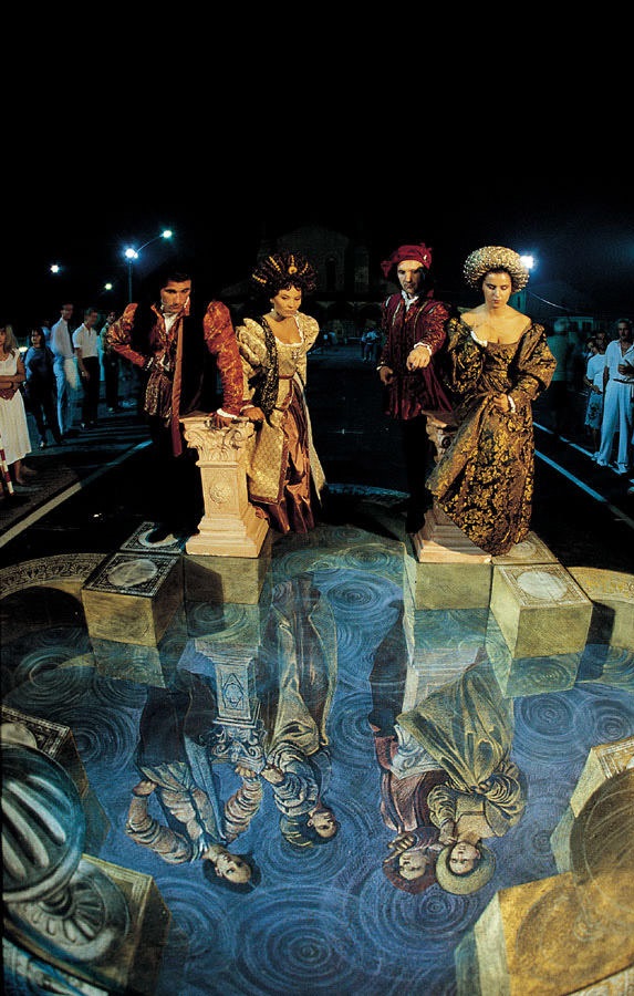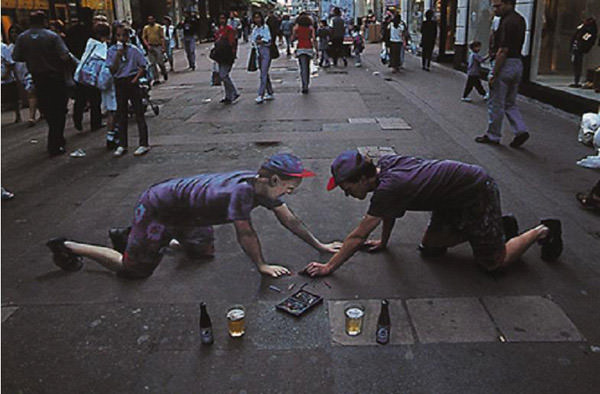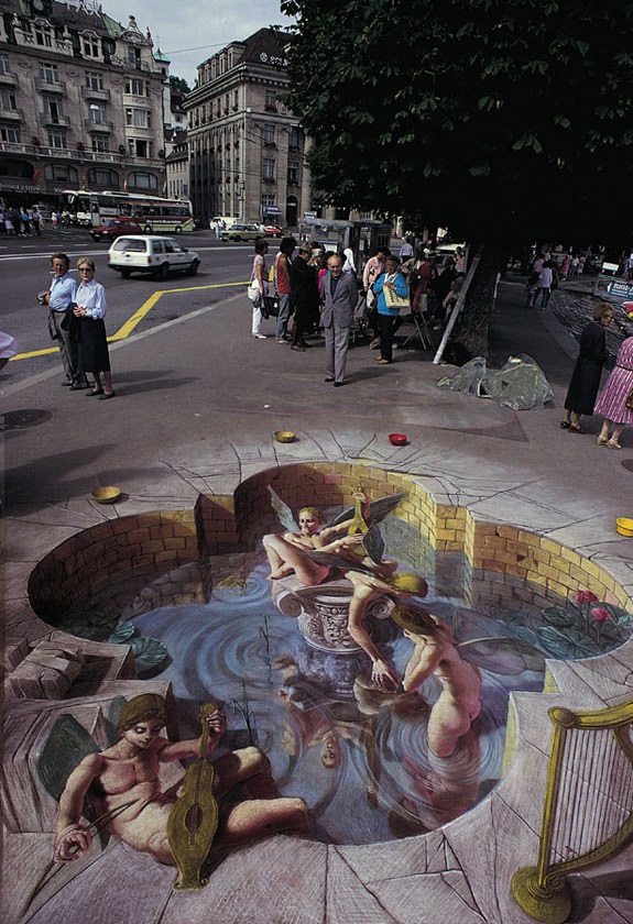 Bu sokak sanatı ise diğerlerinden biraz farklı. caddeye dikilen heykellerin bir de yere oldukça gerçekçi gölgeleri çizilmiş. 3 boyutlu çizim sanki heykellerin hemen önünde bir havuz varmış gibi görünmekte.
