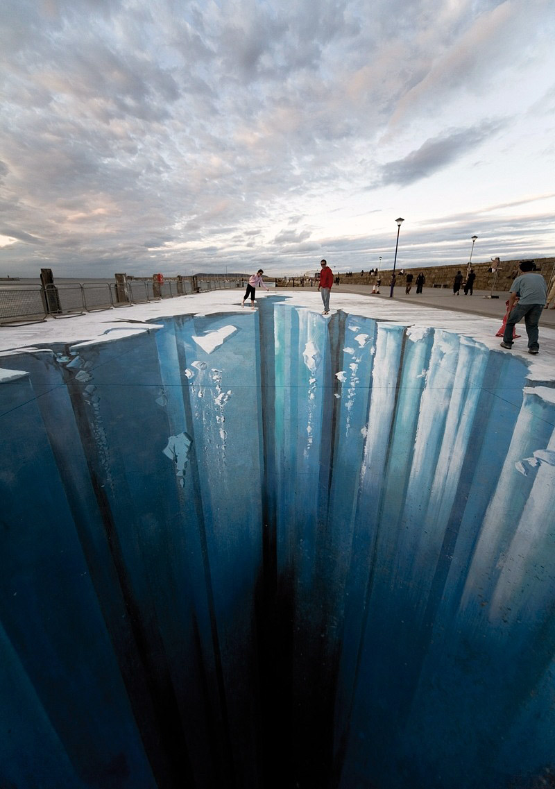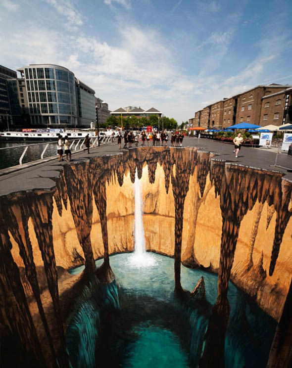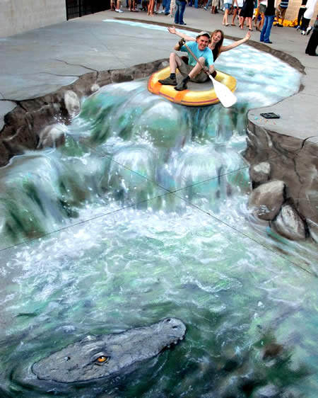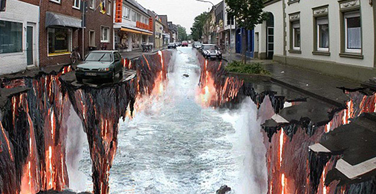 3 boyutlu resimler her zaman gerçekçi ve etkileyicidir. tıpkı kaldırıma çizilmiş bu inanılmaz doğa manzarası gibi. sanki yolun ortasından farklı bir dünyaya kapı açılıyor.