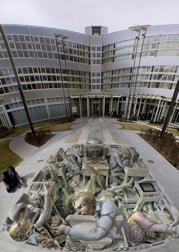 Şirketlerin ve ofislerin bir gününü anlatan bu resim ise oldukça başarılı. başarılı bir şekilde bir şirketin hemen girişine çizilmiş bu 3 boyutlu resim içerisinde çokca mesajı da barındırmakta.